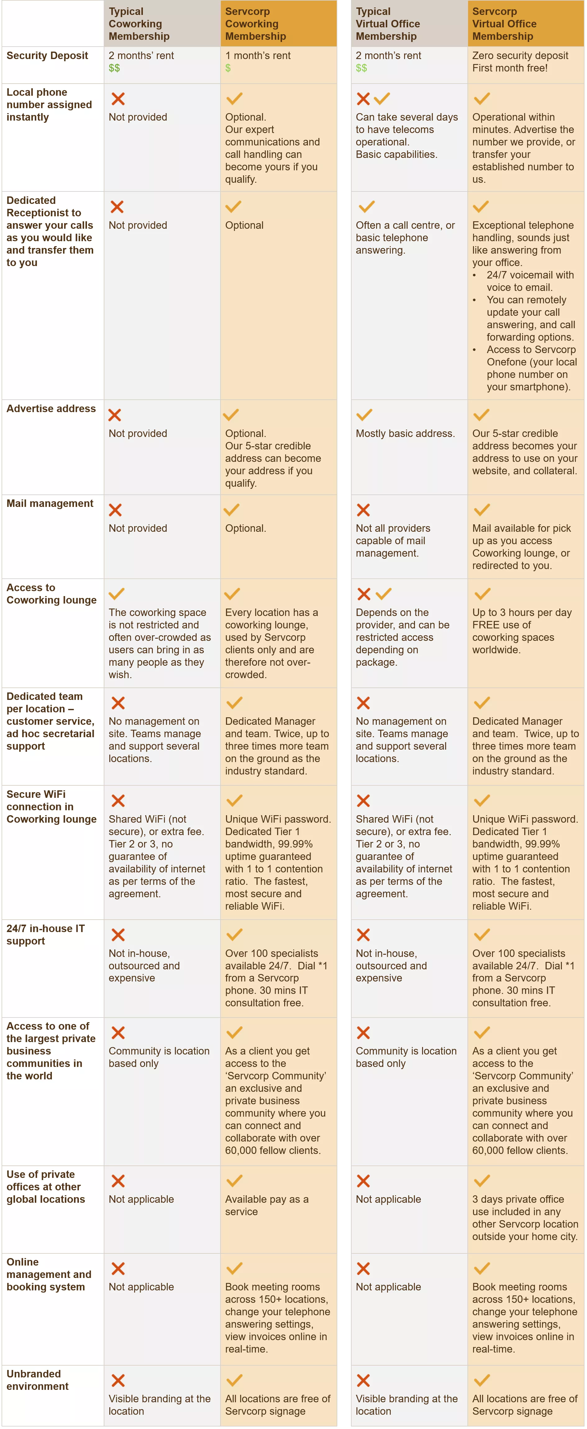 Additional comparison and benefits provided with Servcorp Coworking and Virtual Office models: